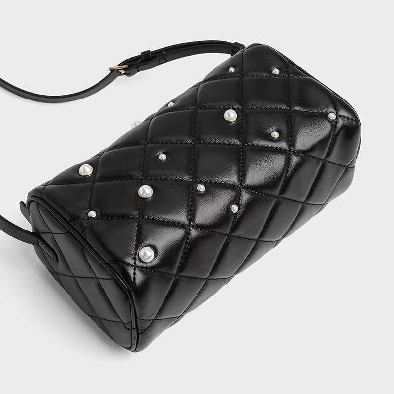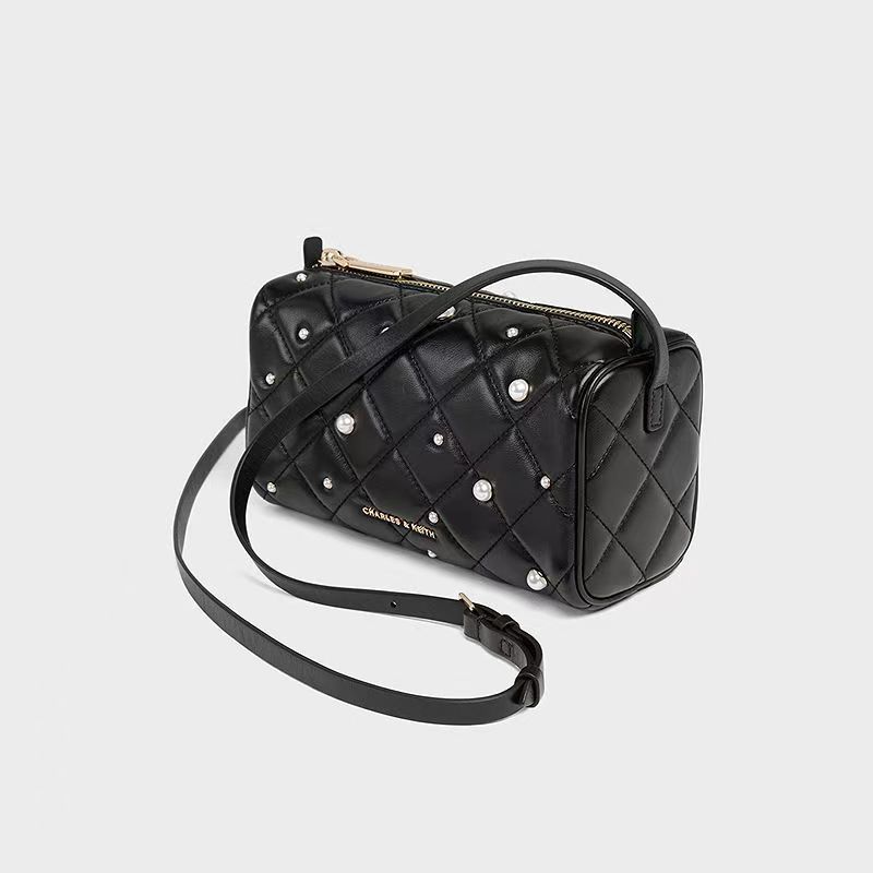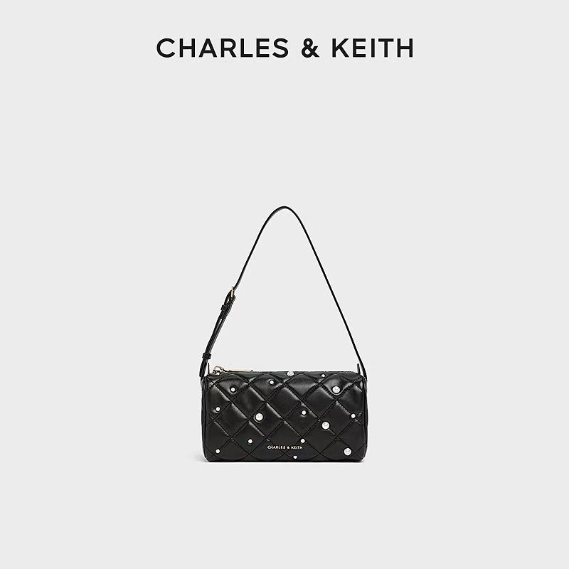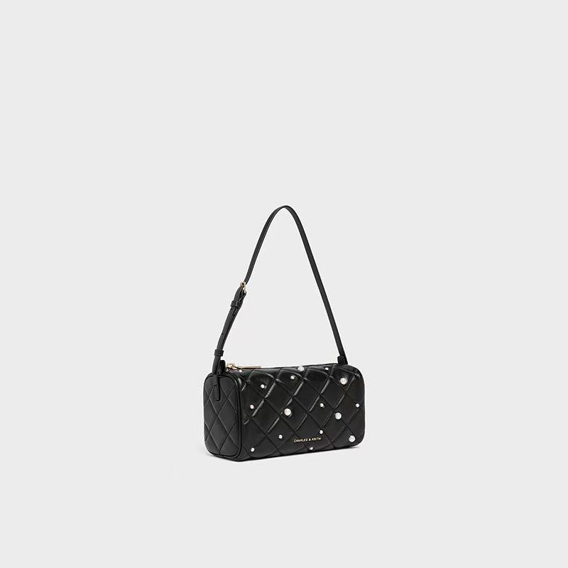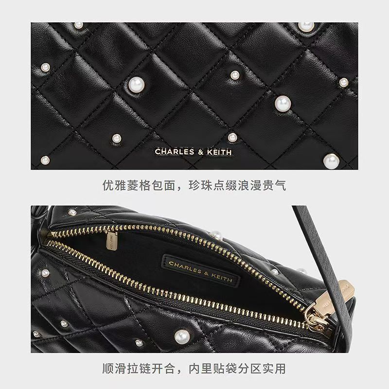 新年CHARLES&KEITH25冬CK2-20701600-B菱格珍珠飾手提斜挎腋下包