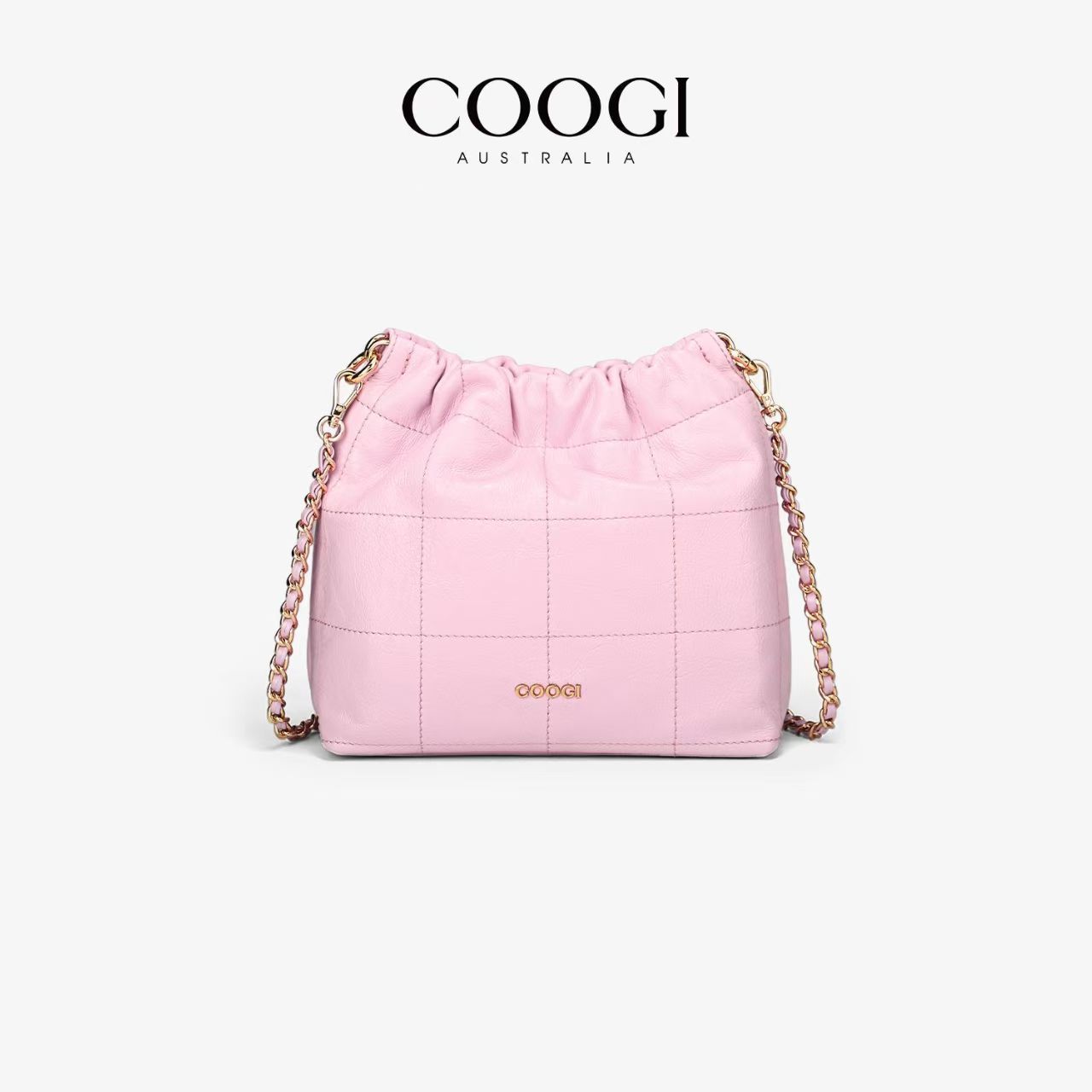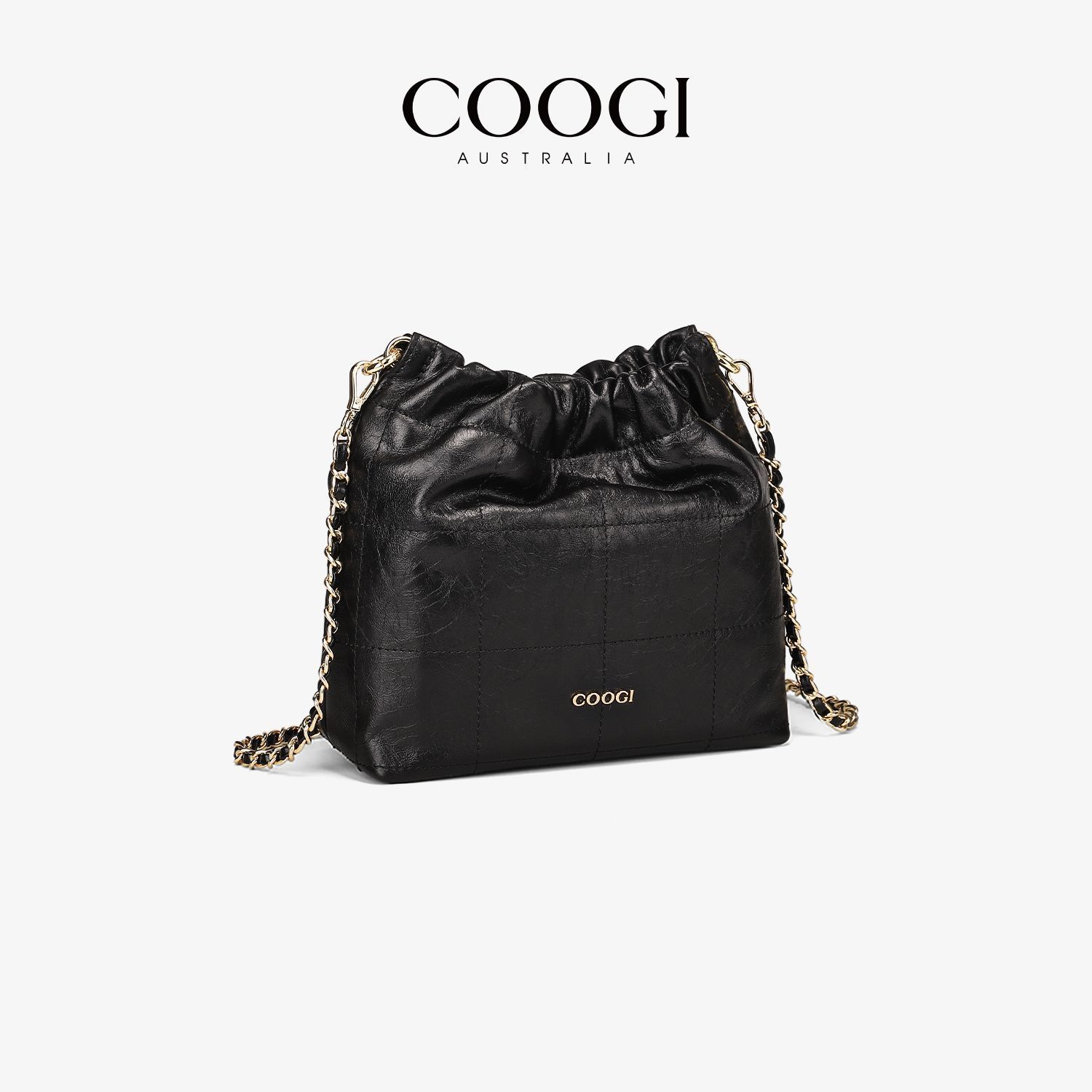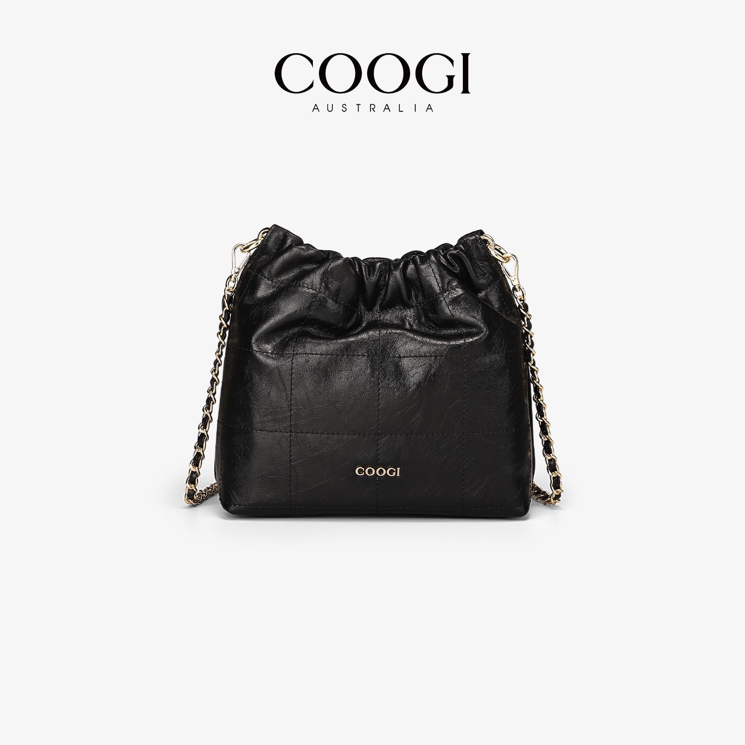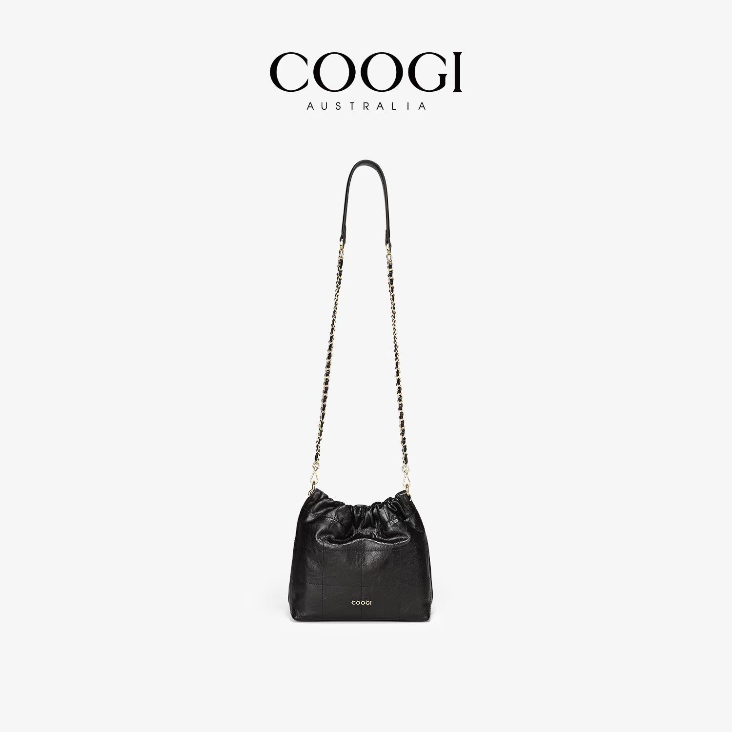 COOGI時尚真皮水桶包簡約風大容量通勤新款褶皺鏈條單肩斜挎包包