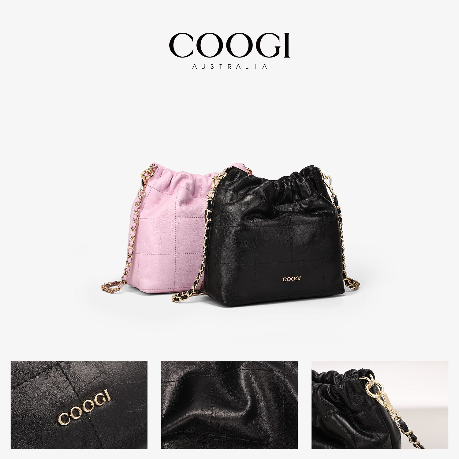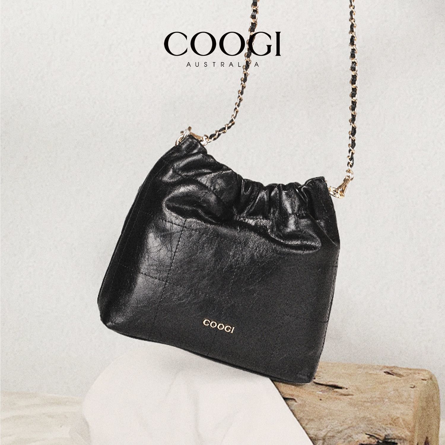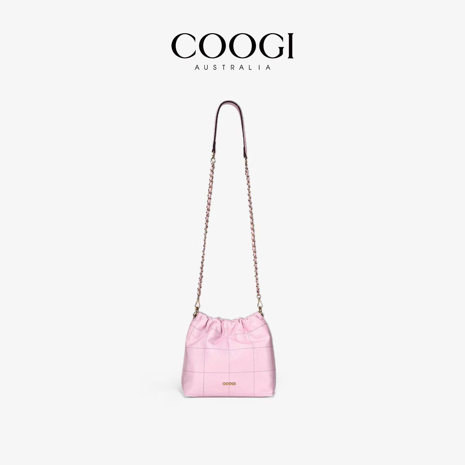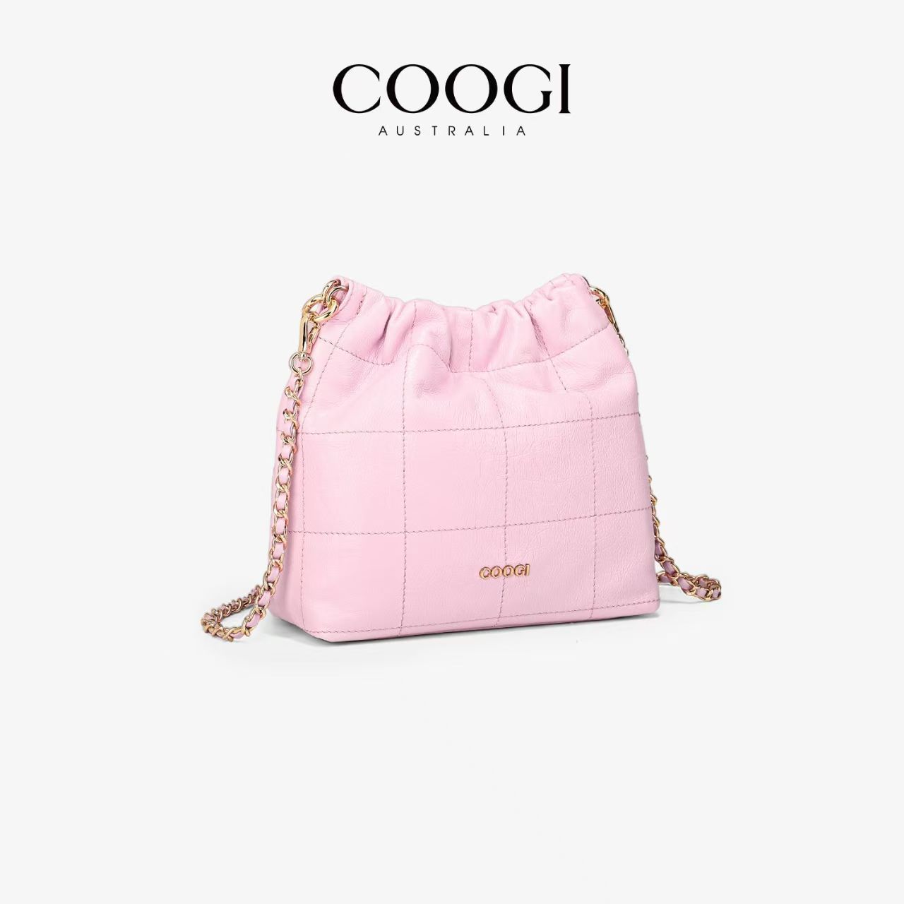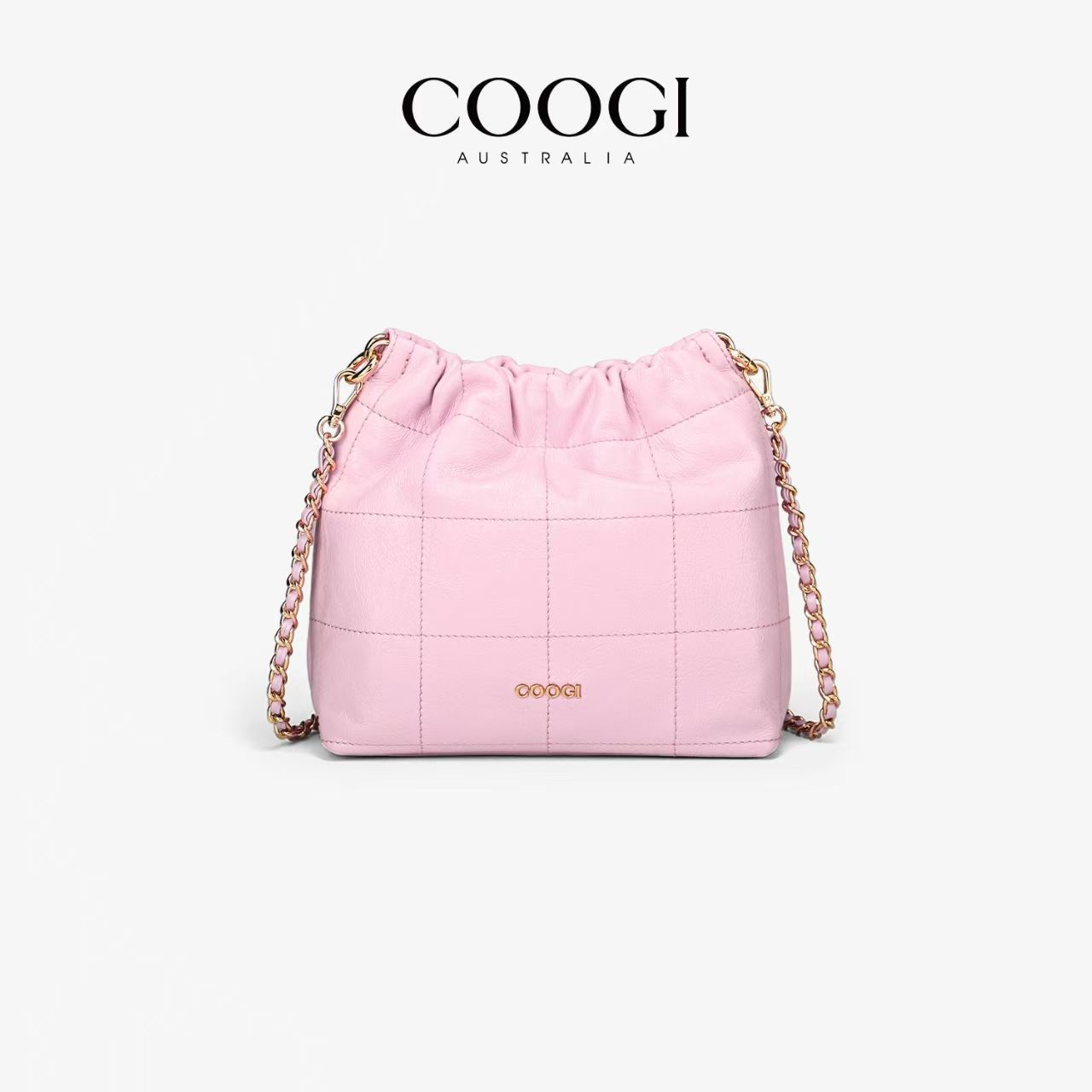 COOGI時尚真皮水桶包簡約風大容量通勤新款褶皺鏈條單肩斜挎包包
