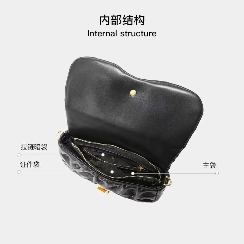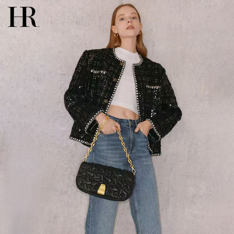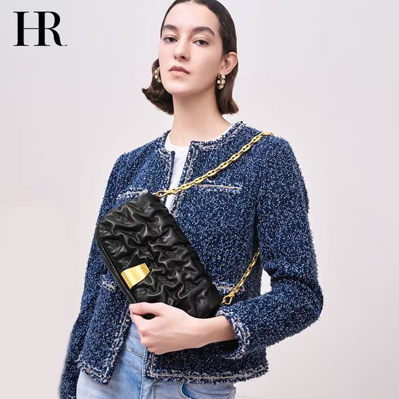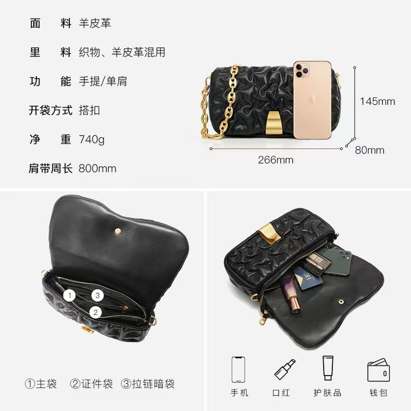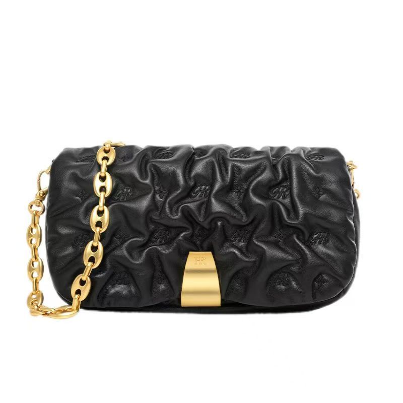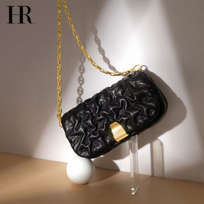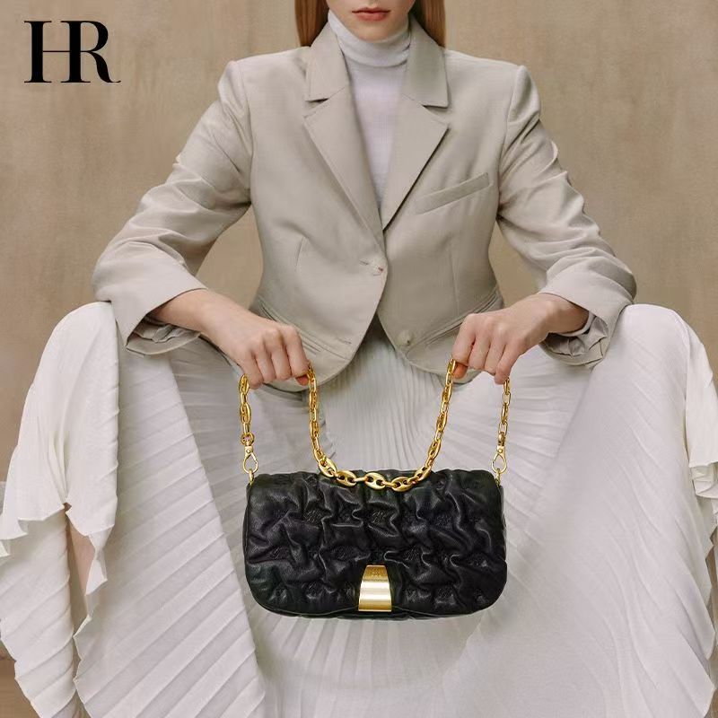 HR赫蓮娜包包秋冬新款羊皮小方包輕奢百搭單肩包褶皺鏈條斜挎包女