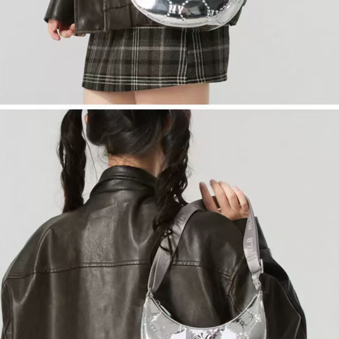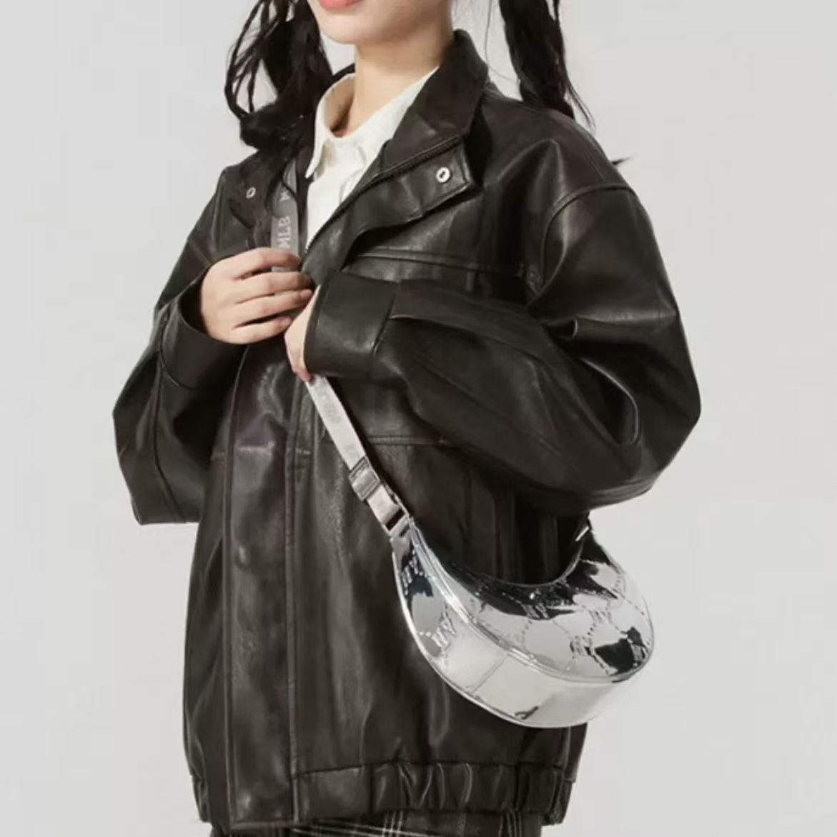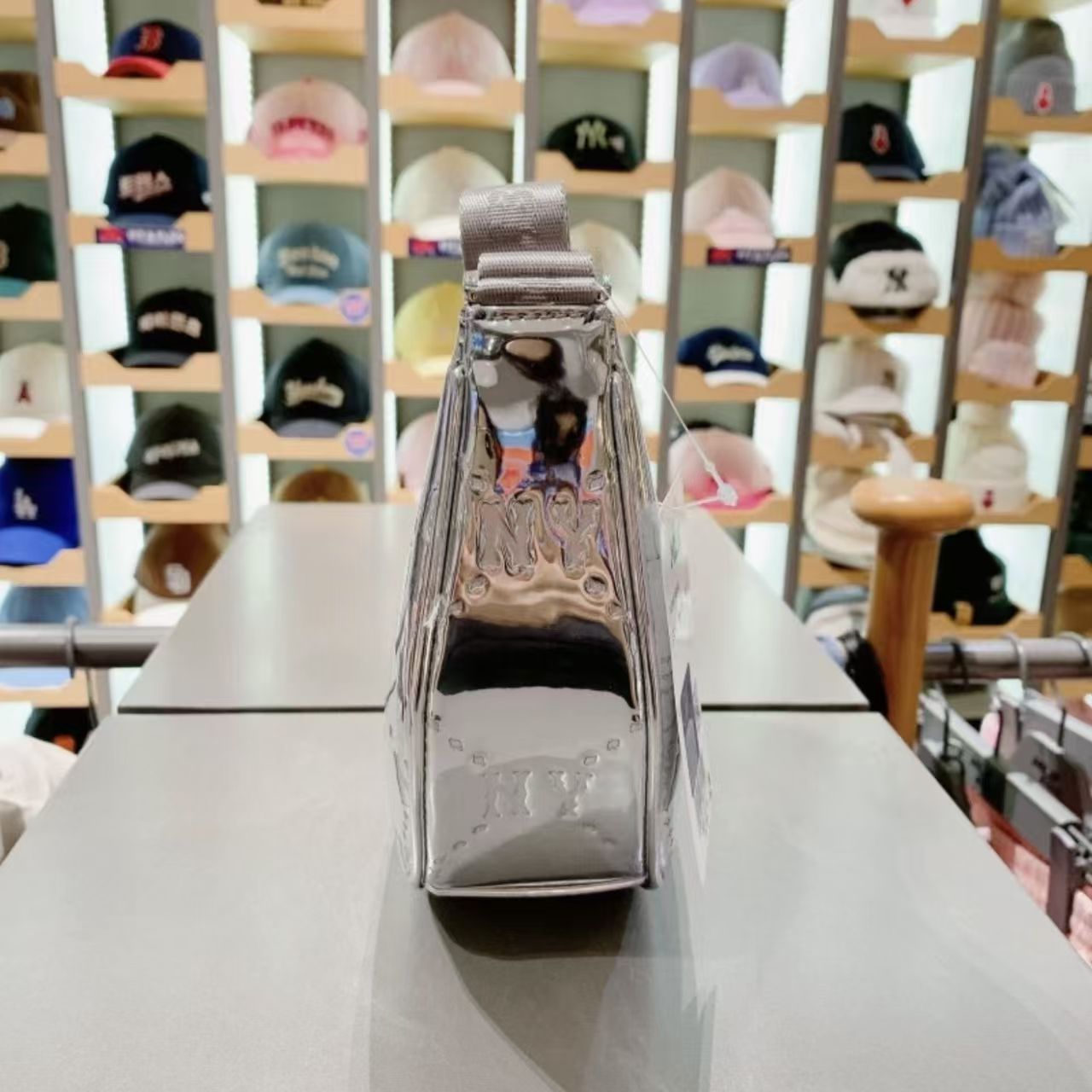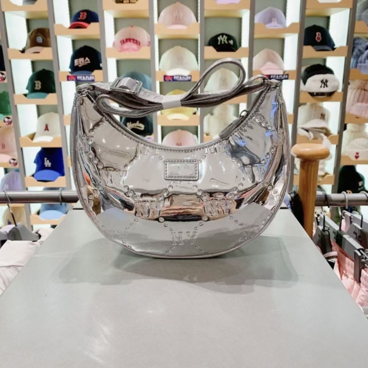 MLB復古鉆石壓花滿標拉鏈亮面單肩包月牙包女款手拎包7ACRMD75N